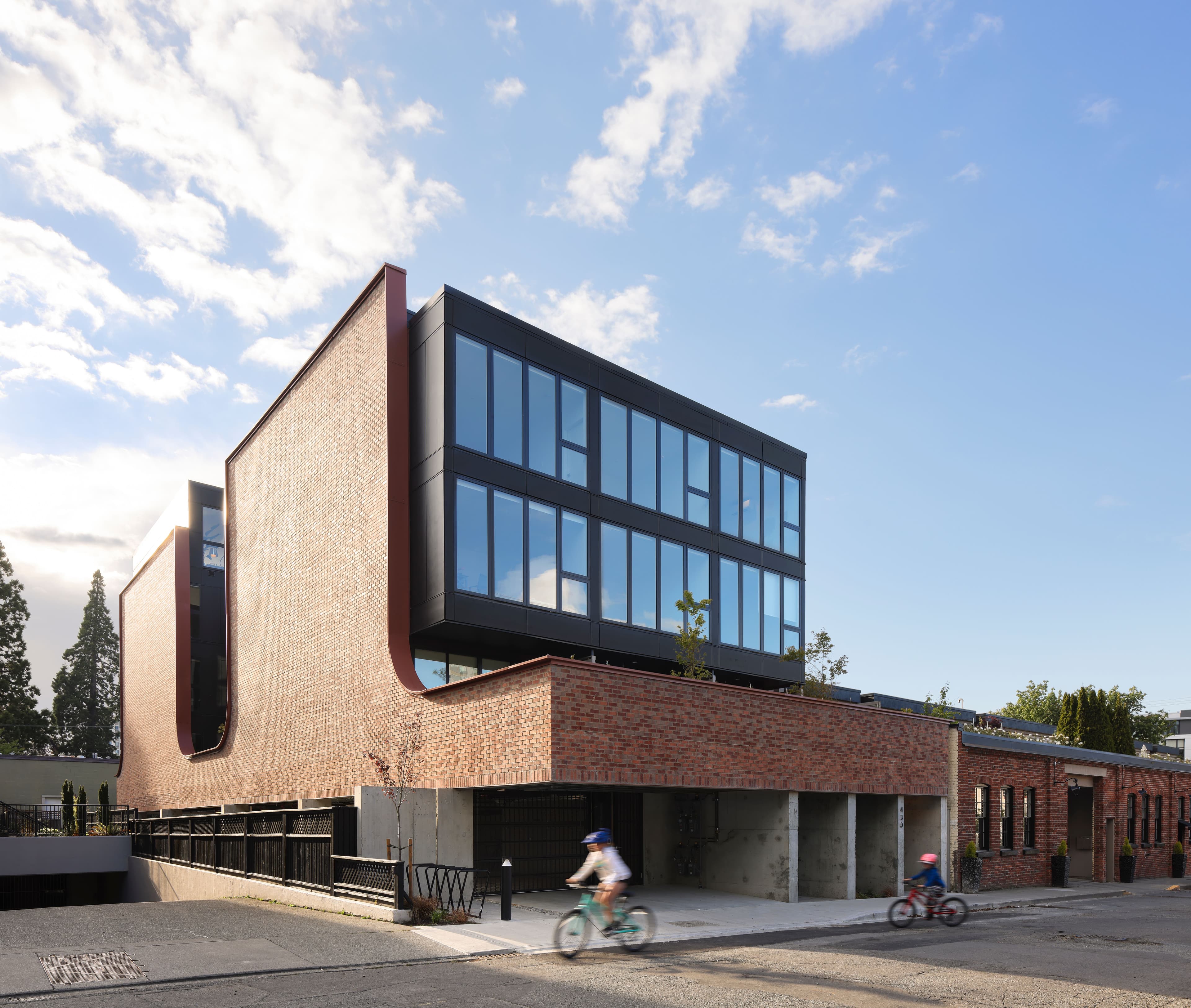 The variety of built and unbuilt sites surrounding Rotunda informed the basic shape of the building, taking into consideration the smaller grained neighbouring buildings to the northwest. The resulting design is two separate small-scale buildings flanking a central U-shaped courtyard. These three volumes float over an open-air parking space.